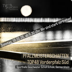 Am Sonntag, den 18.01.2026, startet ab 9:30 Uhr die 🏓 Pfalzmeisterschaft Top 48 Vorderpfalz Süd.